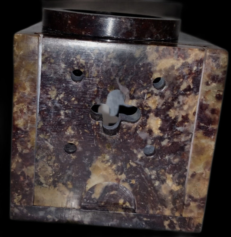 This Soapstone aroma lamp is unique in our collection as it has a trap door for a votive or tea lite instead of a large opening. Just raise or take out the trap door and add your heat source. Then add your favorite scents to the bowl on top and enjoy! This item is 3-pc: the bowl, the box, and the trap door. The carving on the sides adds to its charm while allowing the heat source to receive the oxygen it needs to burn. This is one of the Wizard's favorite aroma lamps. Because this item is made of natural stone, the rock grain and color may vary slightly. The color tone should remain roughly the same. This item is imported from India.