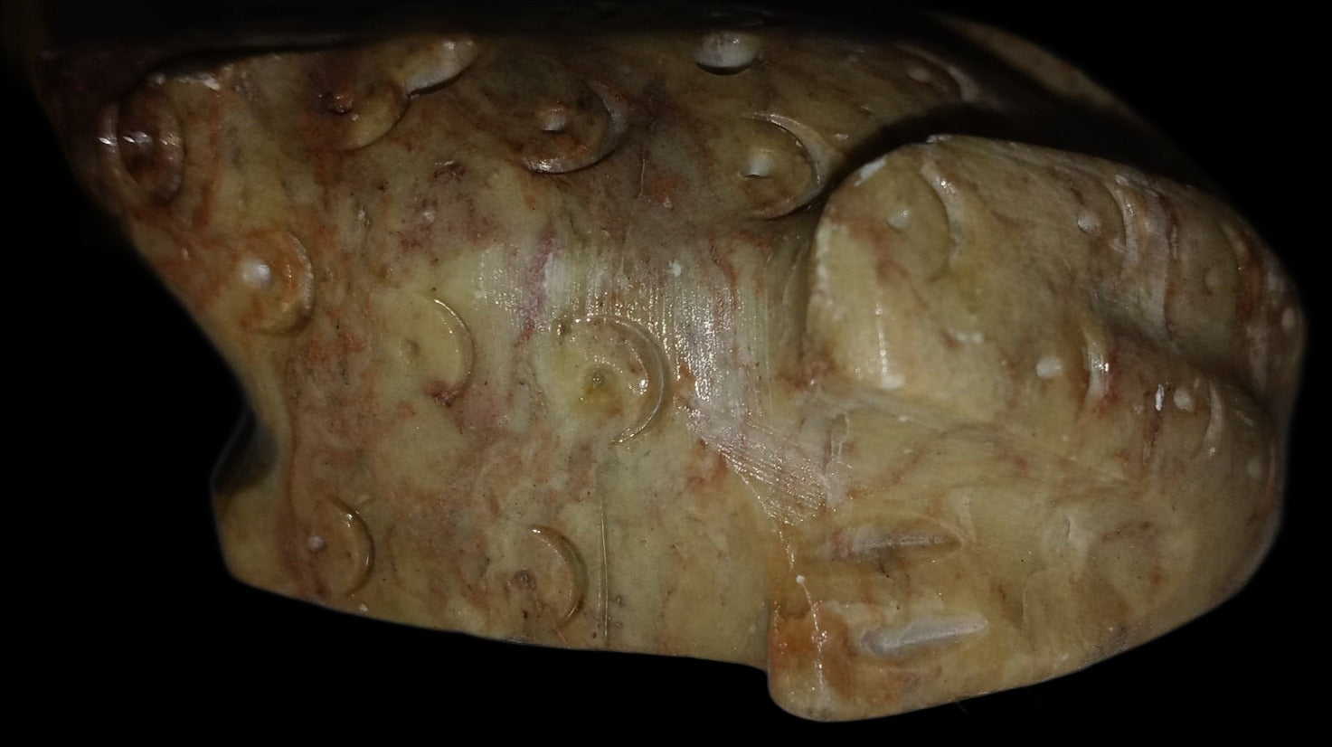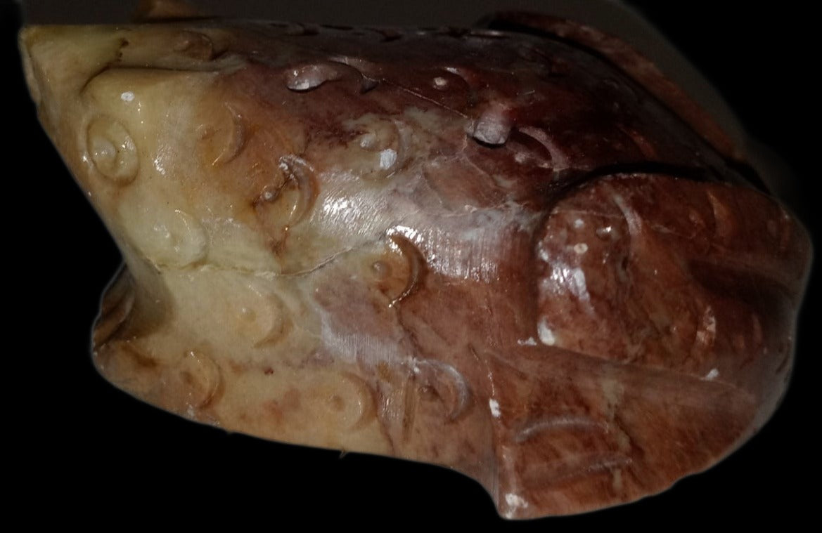 This item is hand carved in India from Soapstone. It may, at times, come alive and move about the house while you are sleeping. I mean, never mind. It is happy being a stick incense burner or just a pretty cool statuette. It has a cool design carved into the "skin". It comes in light, dark, or medium-toned. As this item is made out of natural rock, stone grain and color may be slightly different from the pictures. This item is imported from India.