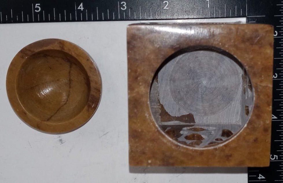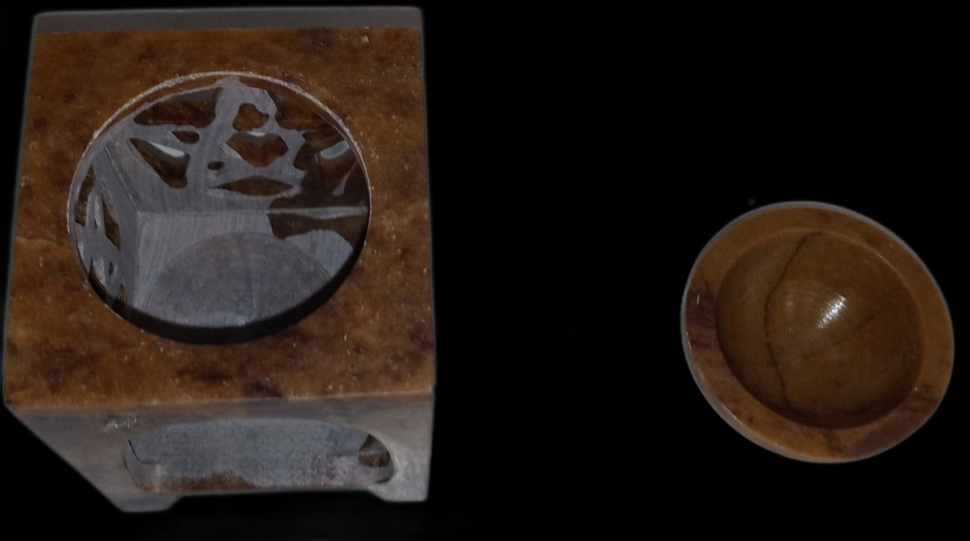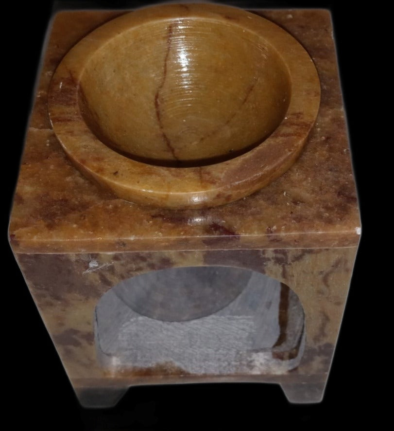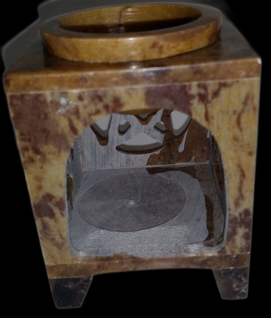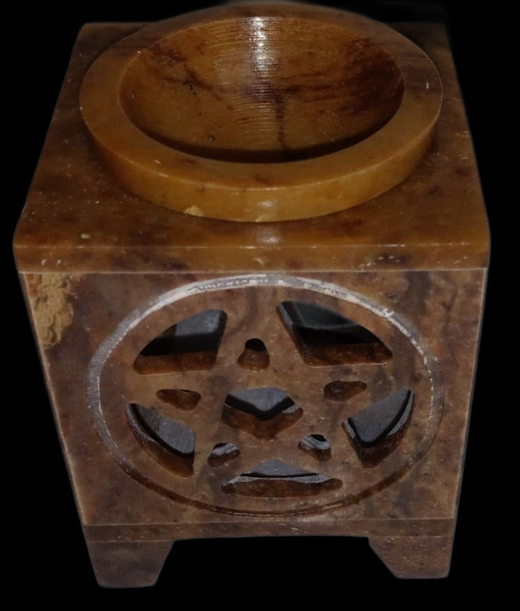 This item is hand carved from Indian Soapstone. It has a large opening in the back for a votive or tea lite and stubby legs to protect furniture. The bowl comes off the top for easy cleaning. This item also looks good on a bookshelf or altar that you may need some odoriferous emanations. The other three sides have the carved pentacles. As this is a natural product, the color and rock grain may differ from the picture slightly. This item is imported from India.