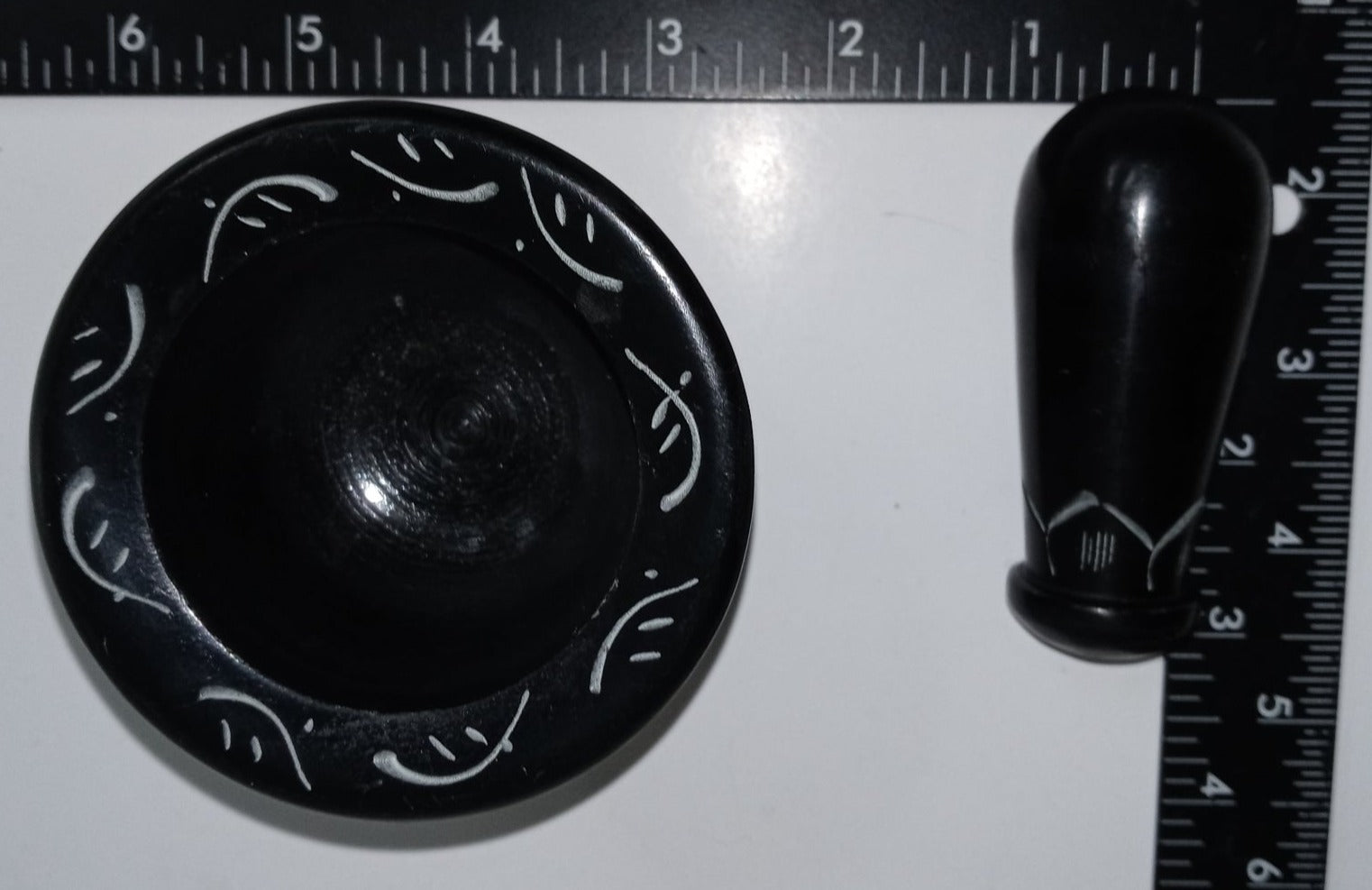 This 3" deep soapstone mortar and pestle are perfect for anyone's kitchen, home pharmacy, or apothecary. It is polished black soapstone with an unpolished Celtic design. Whether it is this design or another, no self-respecting Wizard, Sorceress, Witch, Herbalist, Pharmacist, Witchdoctor, Naturalist, Assassin, or Rogue would be caught without at least one mortar and pestle in their laboratory, kitchen, apothecary, basement, pharmacy, tower, etc. The Wizard has a few. Depending on the use, he uses soapstone, granite, or marble. Because it is made of natural rock color may differ slightly but will still be black. This item is imported from India.