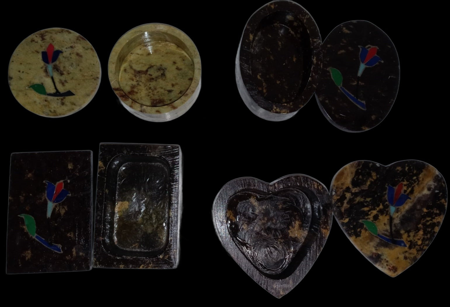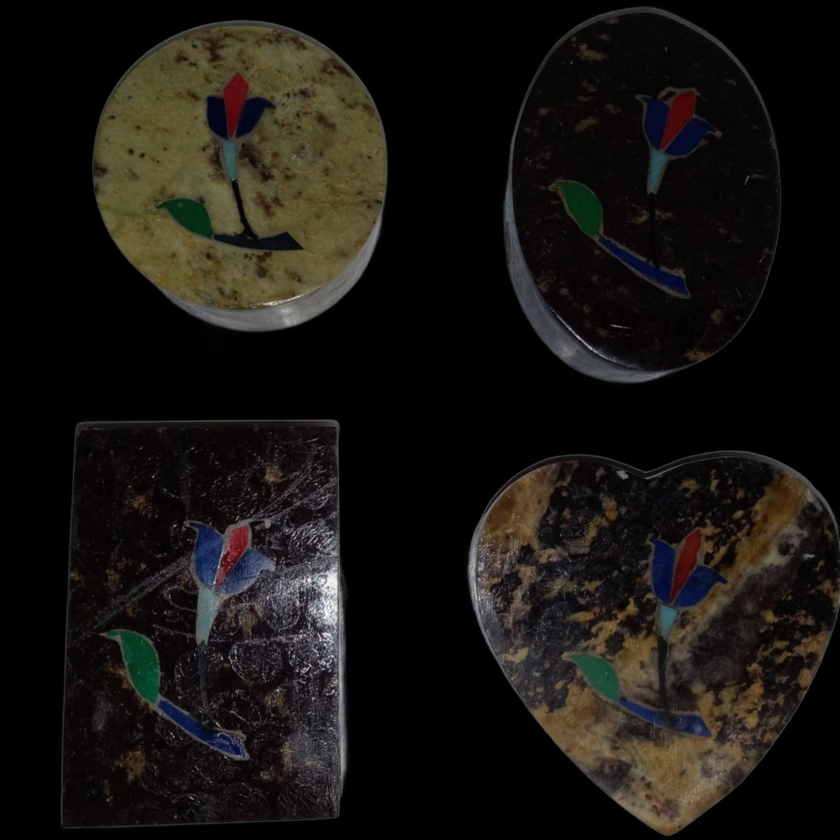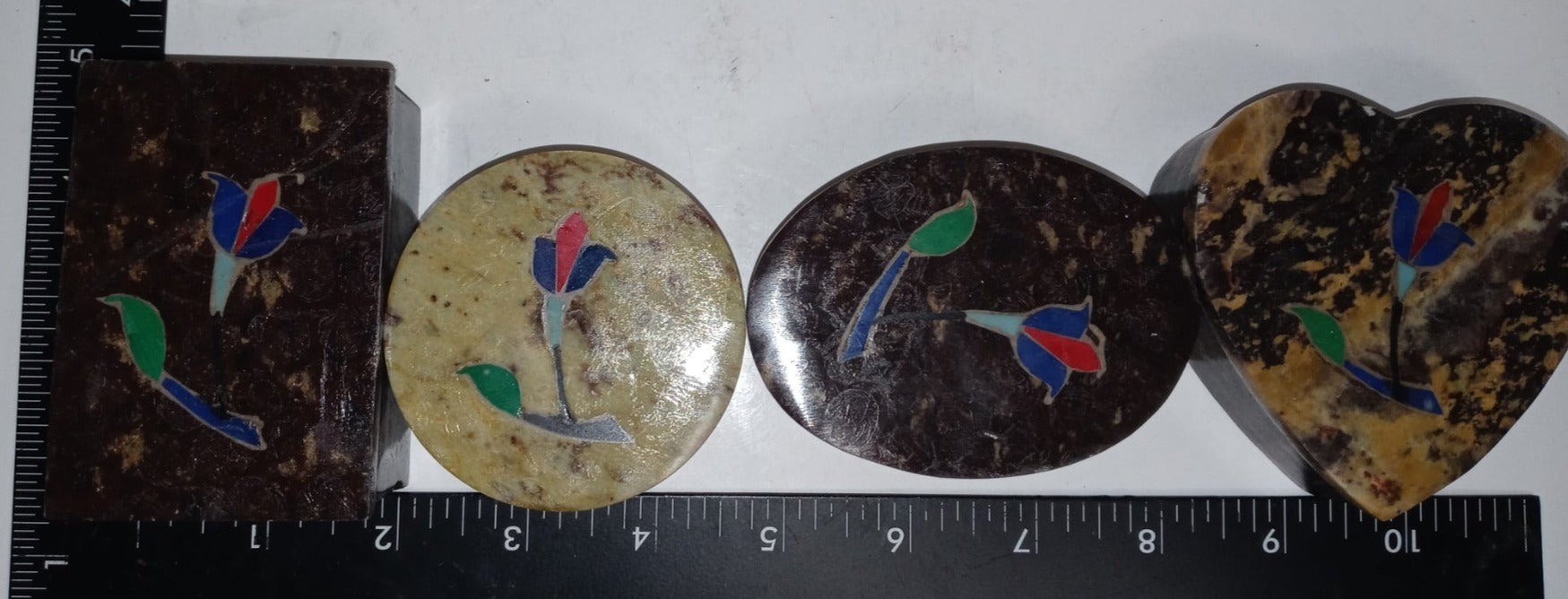 This item is hand carved soapstone. It has a flower inlay and comes in 4 styles. Because this item is made of natural rock, the grain and color may vary, however, the general tone will remain the same. These boxes have a fitted lid and a thicker wall so they will last. Store makeup, stash, or anything else you may wish to store. The rectangle box is excellent if you happen to have a tiny Faerie Mummy that you need to hide a way for a while. When choosing your style, if the Wizard is out of a particular color in a certain style, the Fulfilment Skeletons will prioritize your style or color. Because this item is made of natural soapstone, you can keep it in the bathroom if you wish to store personal grooming items. This item is imported from India.