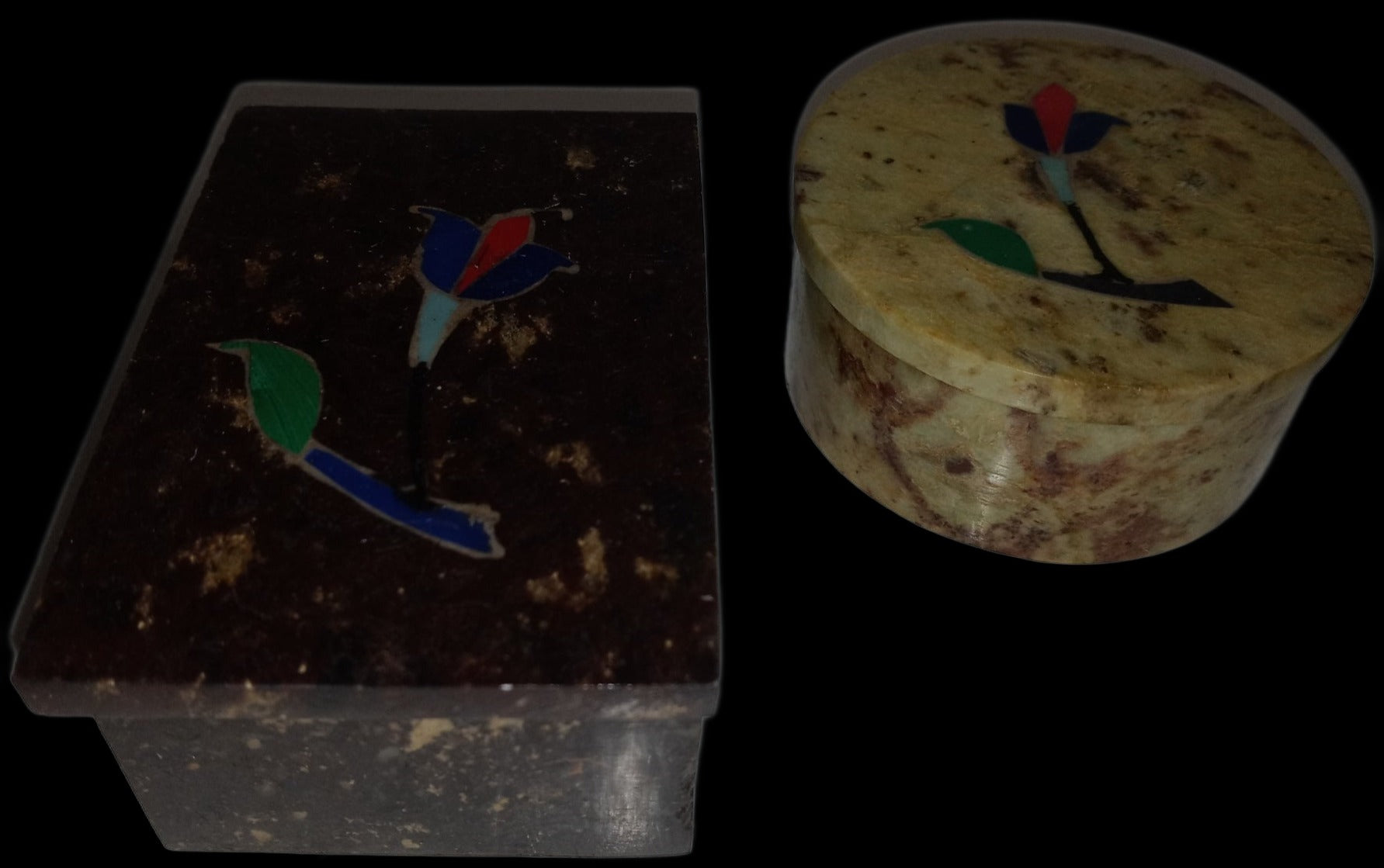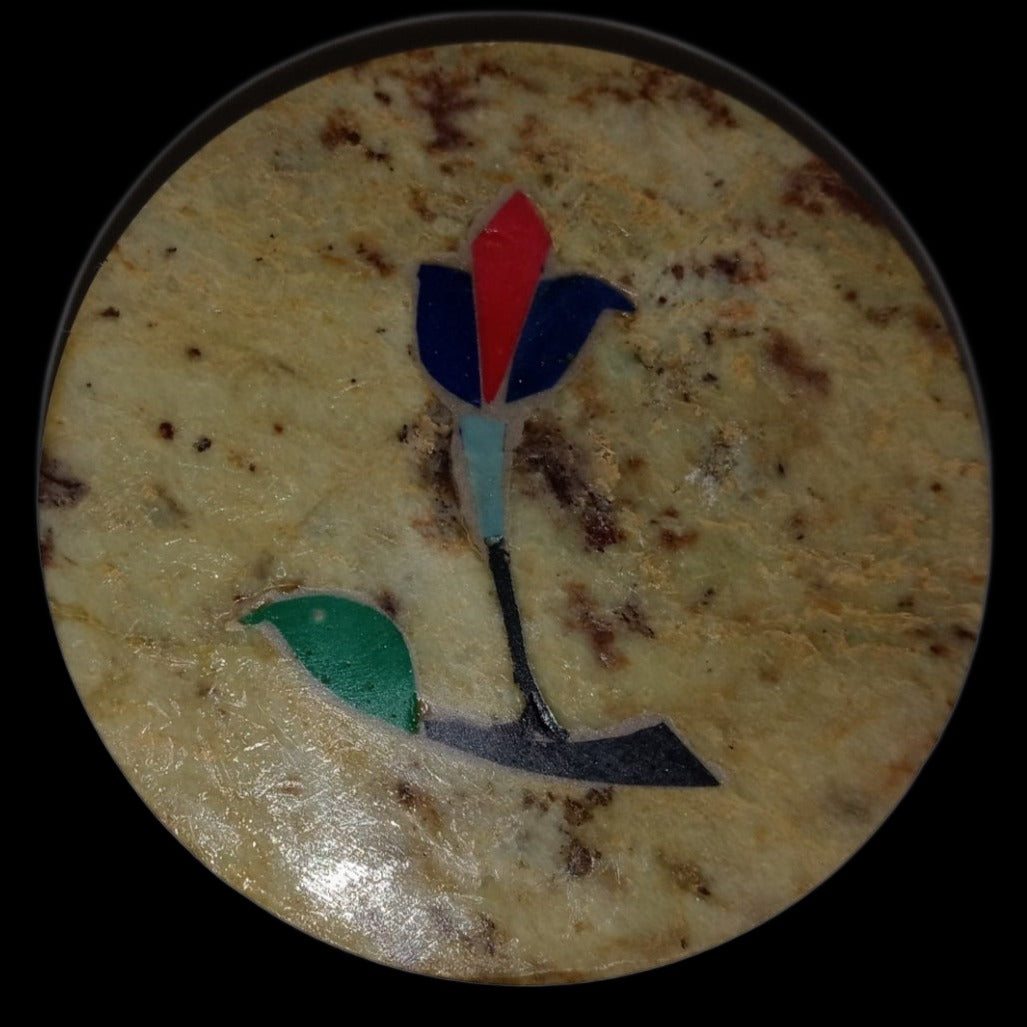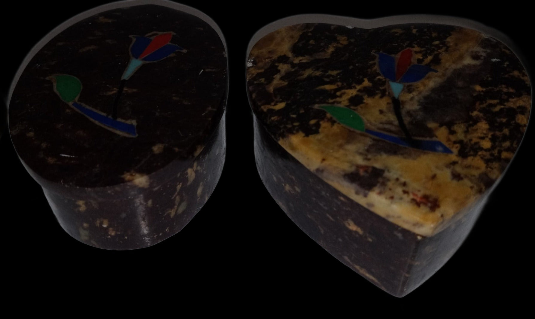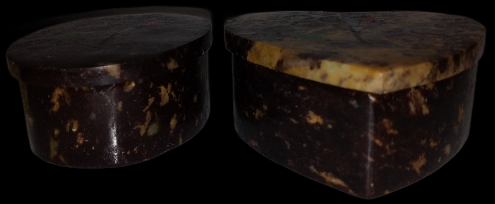 This item is hand carved soapstone. It has a flower inlay and comes in 4 styles. Because this item is made of natural rock, the grain and color may vary, however, the general tone will remain the same. These boxes have a fitted lid and a thicker wall so they will last. Store makeup, stash, or anything else you may wish to store. The rectangle box is excellent if you happen to have a tiny Faerie Mummy that you need to hide a way for a while. When choosing your style, if the Wizard is out of a particular color in a certain style, the Fulfilment Skeletons will prioritize your style or color. Because this item is made of natural soapstone, you can keep it in the bathroom if you wish to store personal grooming items. This item is imported from India.