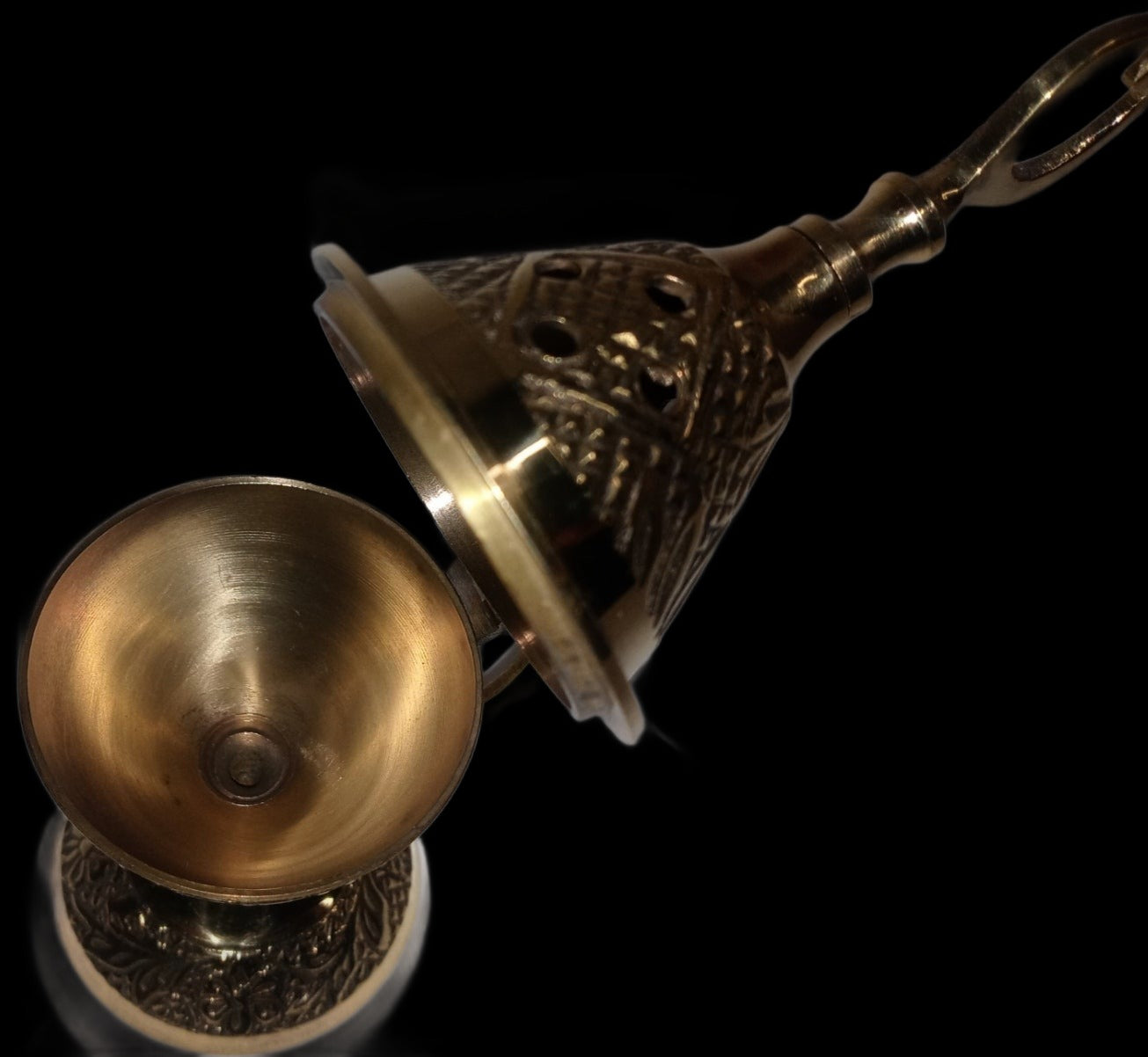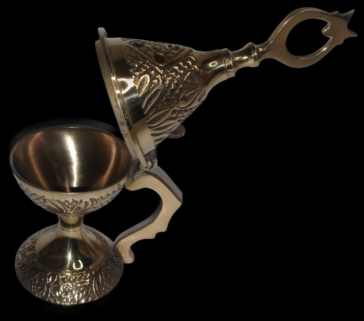This solid brass cone incense burner is perfect for a quiet evening at home or for the background on company night. With the hinged lid, you don't have to worry about burning yourself or losing it. If you are like the Wizard, then you forget things all the time. Actually, forget I said that. Plus, it looks cooler than a 2-pc. This item is imported from India.