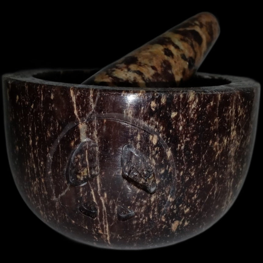This handmade 4.5" Mortar and Pestle has a peace sign carved into the front of it. Being that it is fully polished, it is hard to see the carving from the image, but the peace sign is there. I promise. So, let's all remain peaceful. (See what I did there?) This item is made of natural rock, so small differences may be apparent, but the color will still be the same. Whether you are using it for a home pharmacy or just for some dried herbs, this item will do the job. It is thick and sturdy. This item is imported from India.