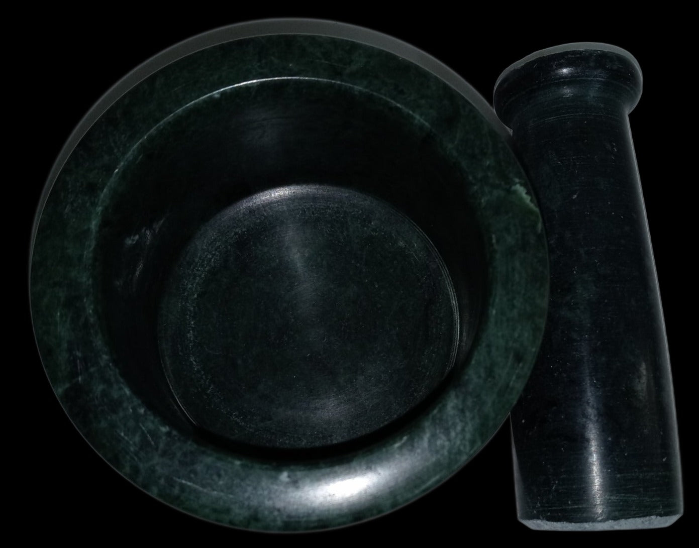 This 4" green mortar and pestle is made of rare green marble. Hence the higher price than our soapstone items. We usually get a high demand for marble, and it always sells out. Hence the limited numbers. It is polished except for the bottom of the mortar and the end of the pestle, for friction to be more effective. As it is actual marble, it is dense for its size. This item is imported from India.