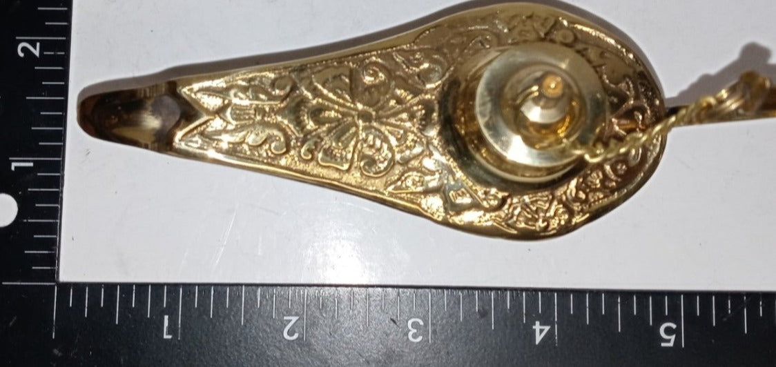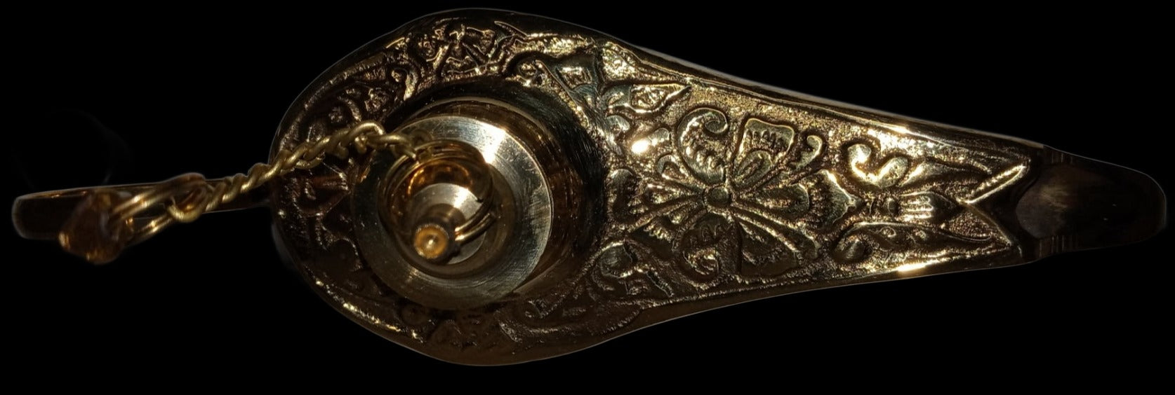 This stylized brass genie lamp cone incense burner is perfect for a mystical decor while also serving a purpose. Remove the little cap and put your favorite cone incense on the little dish and burn away! The lamp top is attached by a brass chain so you can't lose it. The brass is stylized as to not be a boring "token" piece. Know someone who likes genies? Yeah, me neither, but it is still a cool piece to add to a collection. This item is imported from India.