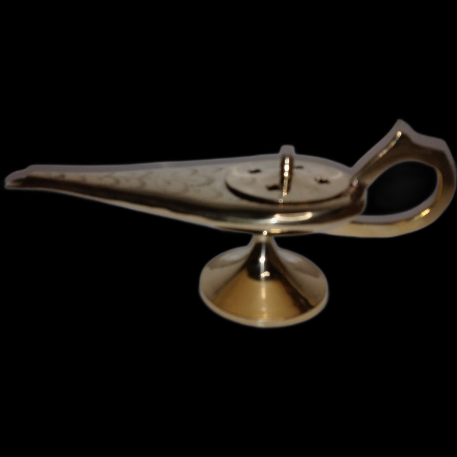 This 8" long brass Aladdin Lamp has a stylized surface and is in the traditional form of an 'Aladdin Lamp'. The lid can be removed to show a hollow basin. Whether you wish to burn incense, store stash, or just hide a really annoying Genie, this lamp is perfect for decor or purpose. The holes in the lid allow for airflow should it be needed. Resin incense are not recommended as it may become really hard to clean if you end up needing to. This item is imported from India.