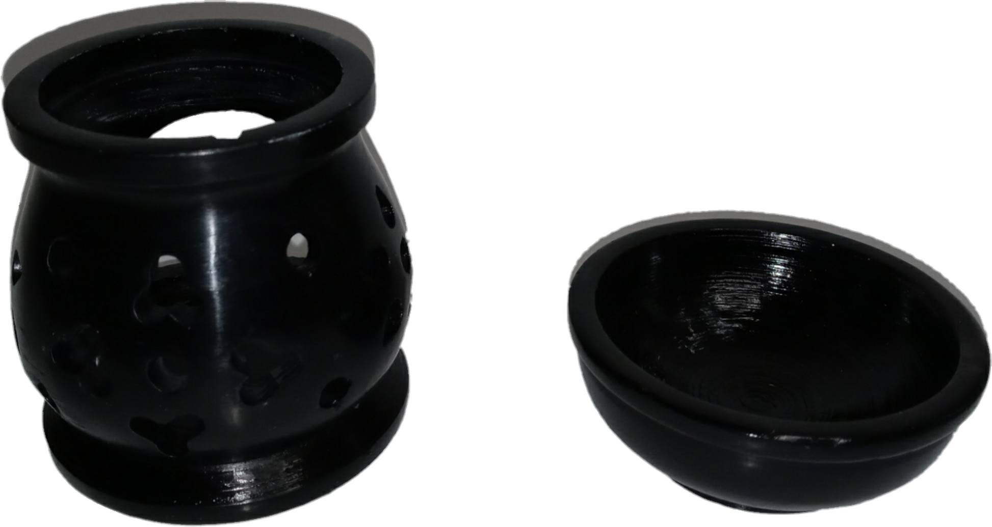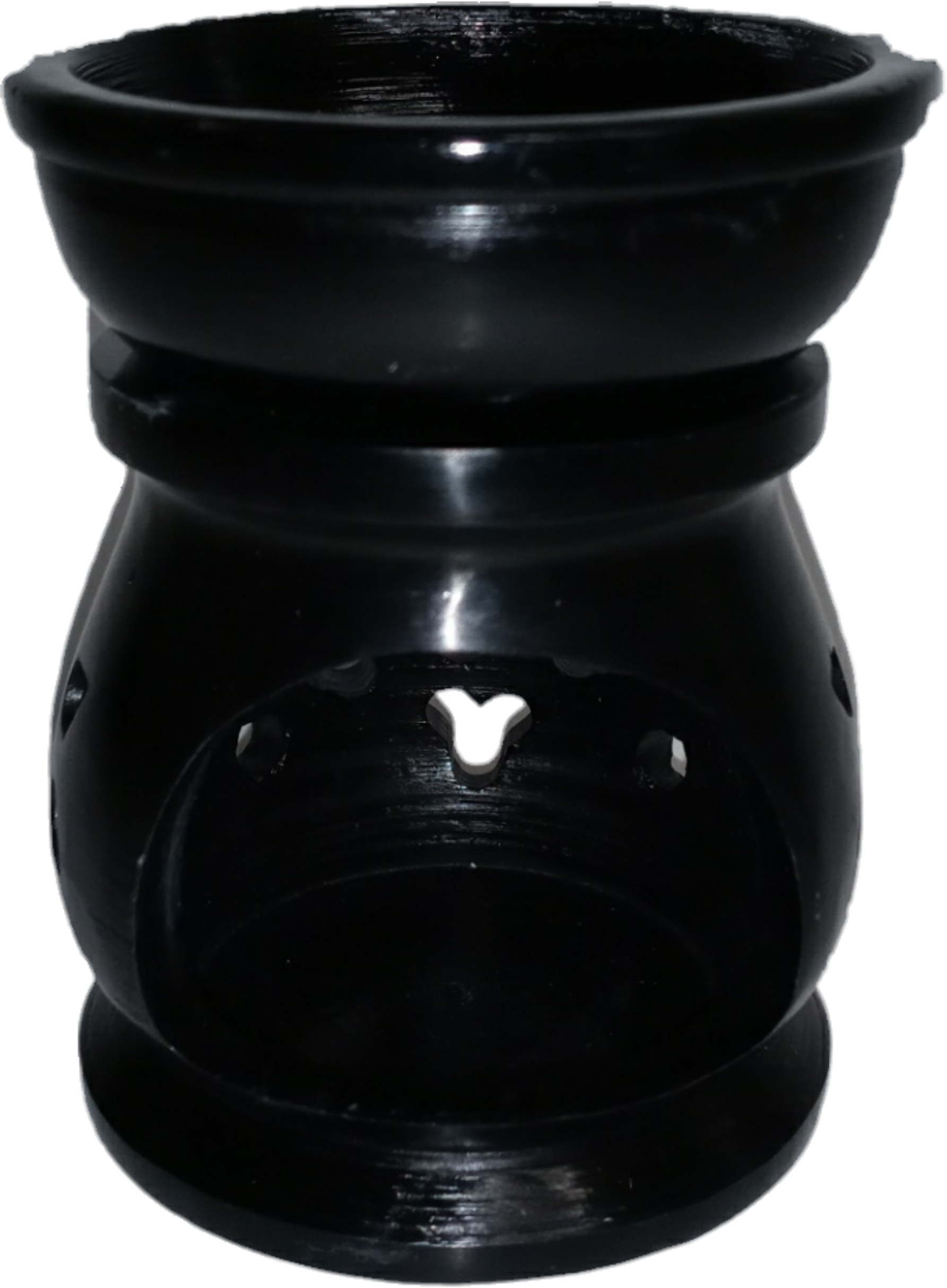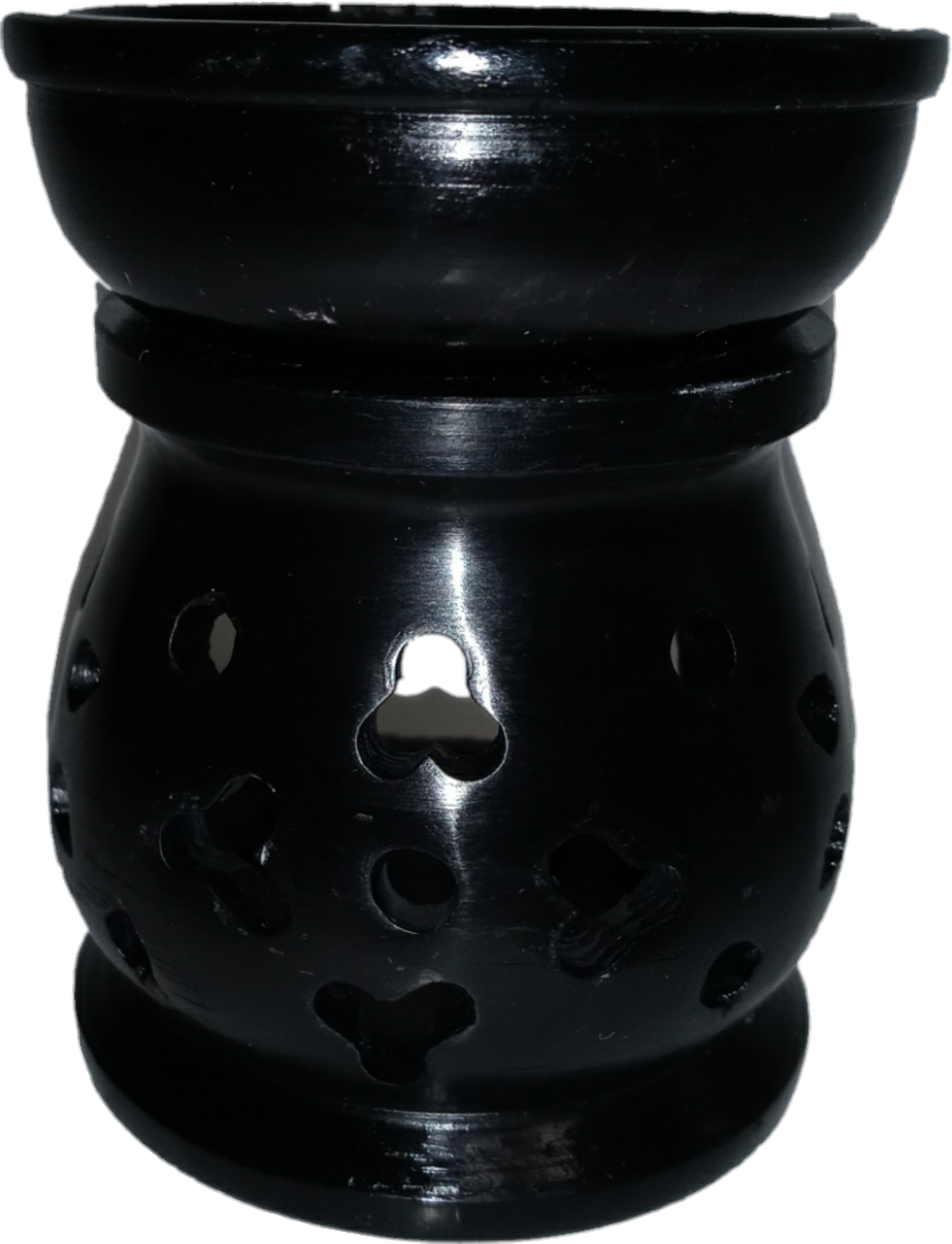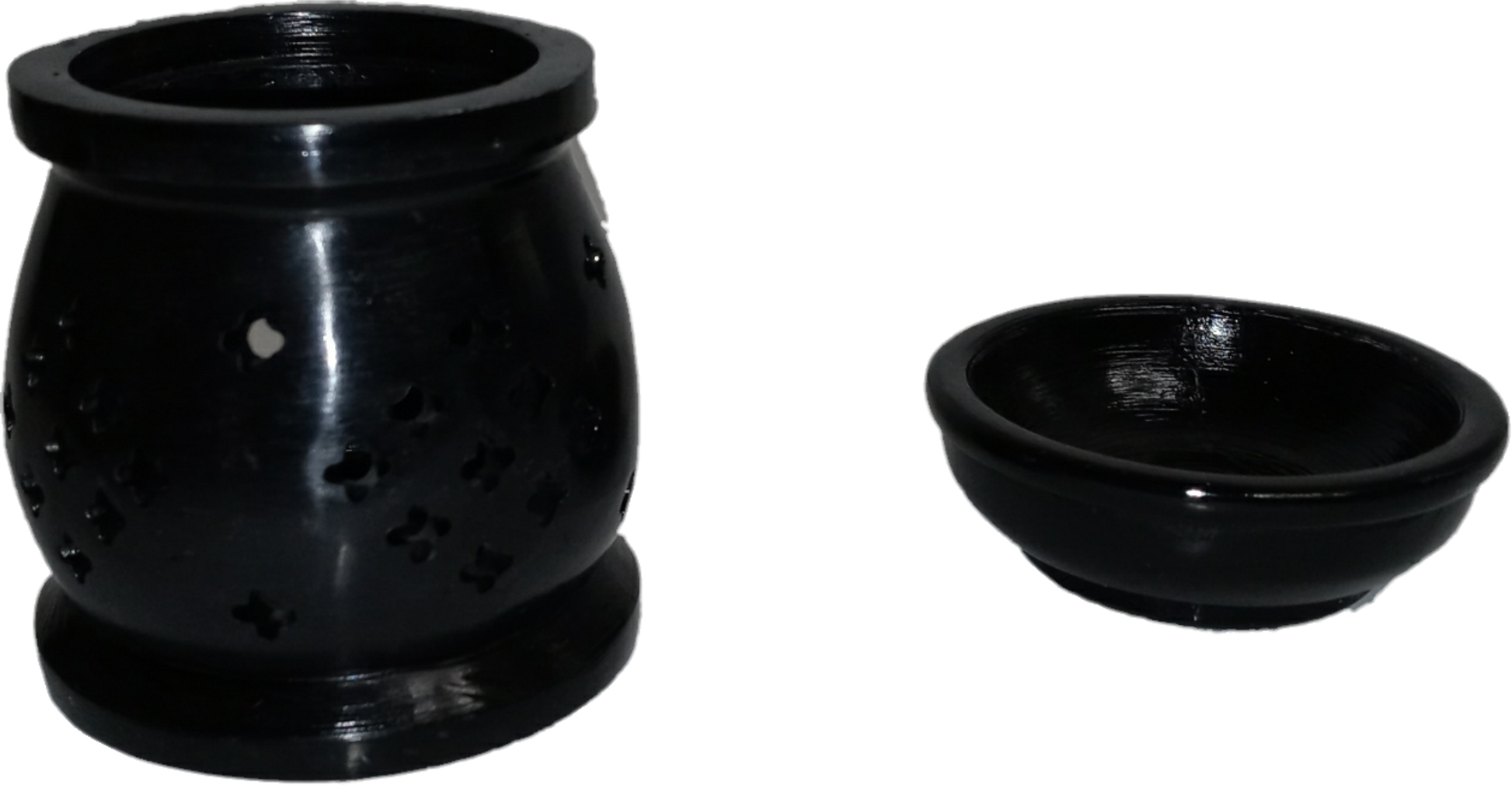 This item is 3" high and is a great lamp if you are into oils and waxes. That is not what I meant, weirdos. Just light your tealight and put it into the opening, put your oil in the bowl and voila! This item has 2 pieces and is imported from India. There are 2 styles for this black lamp: '+' and "Y".