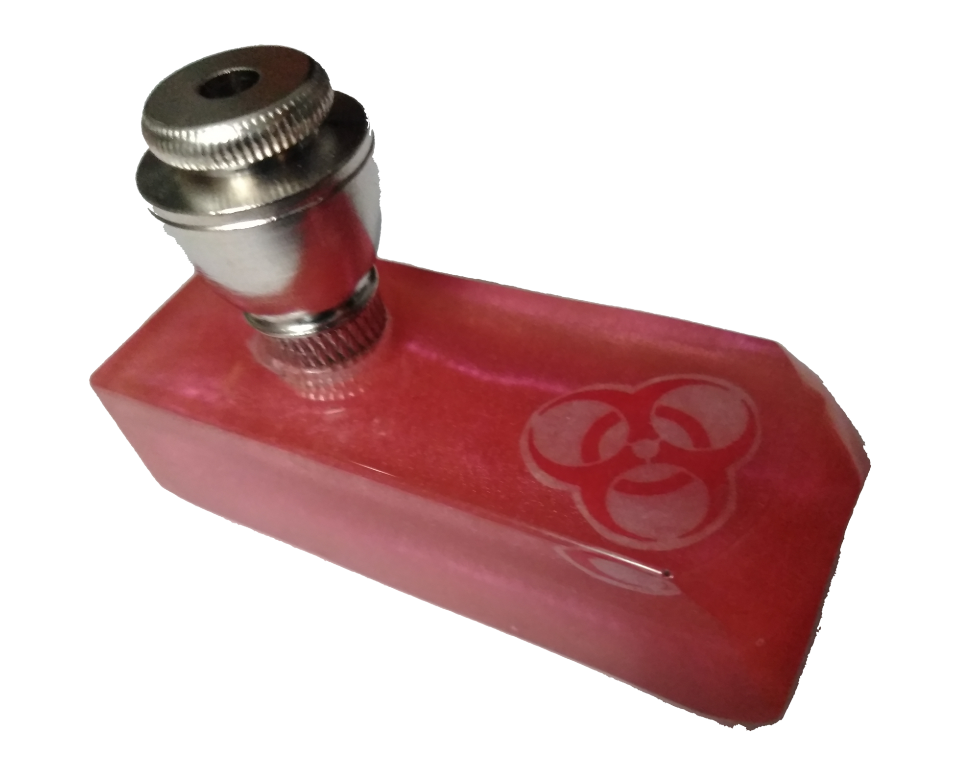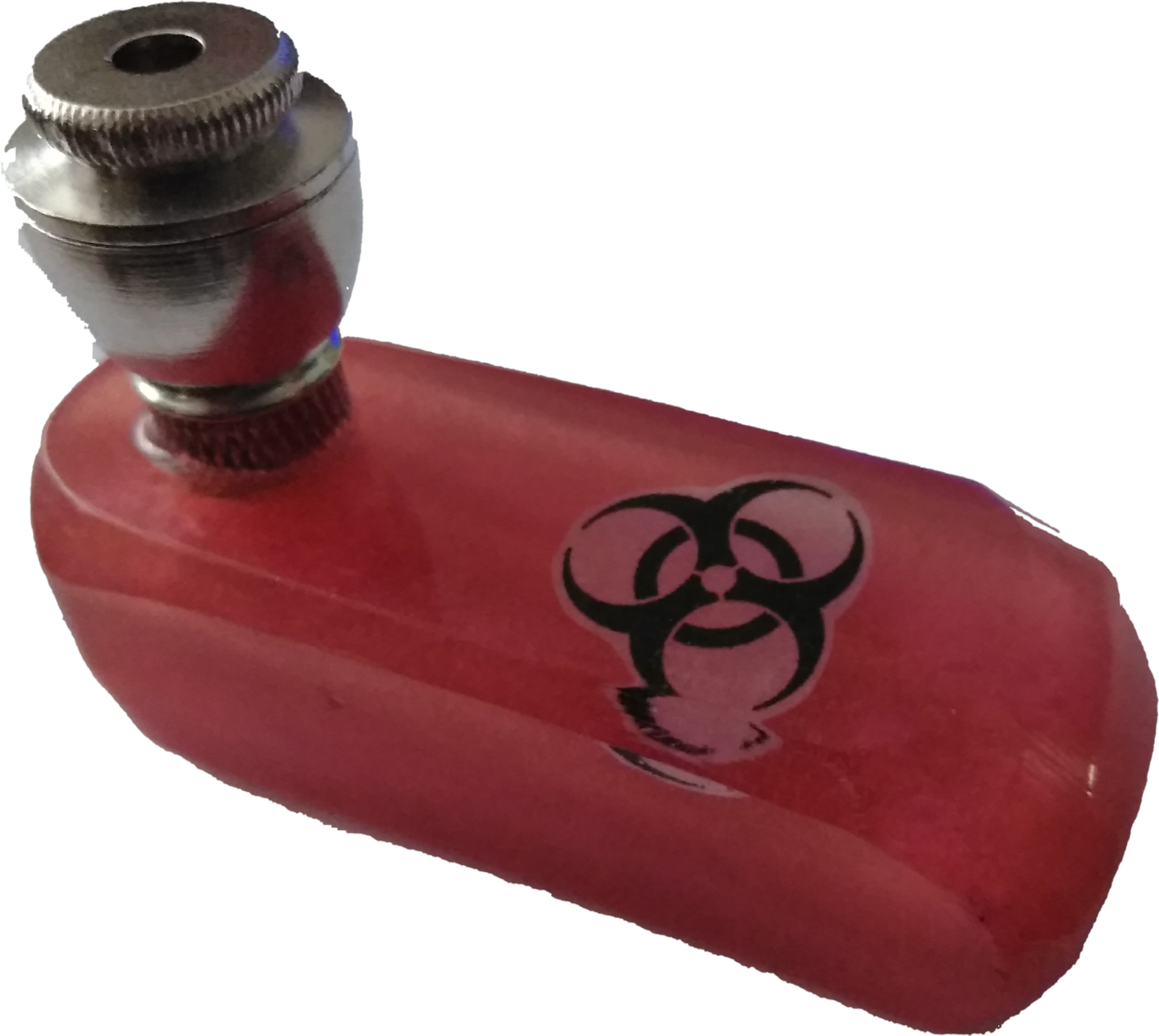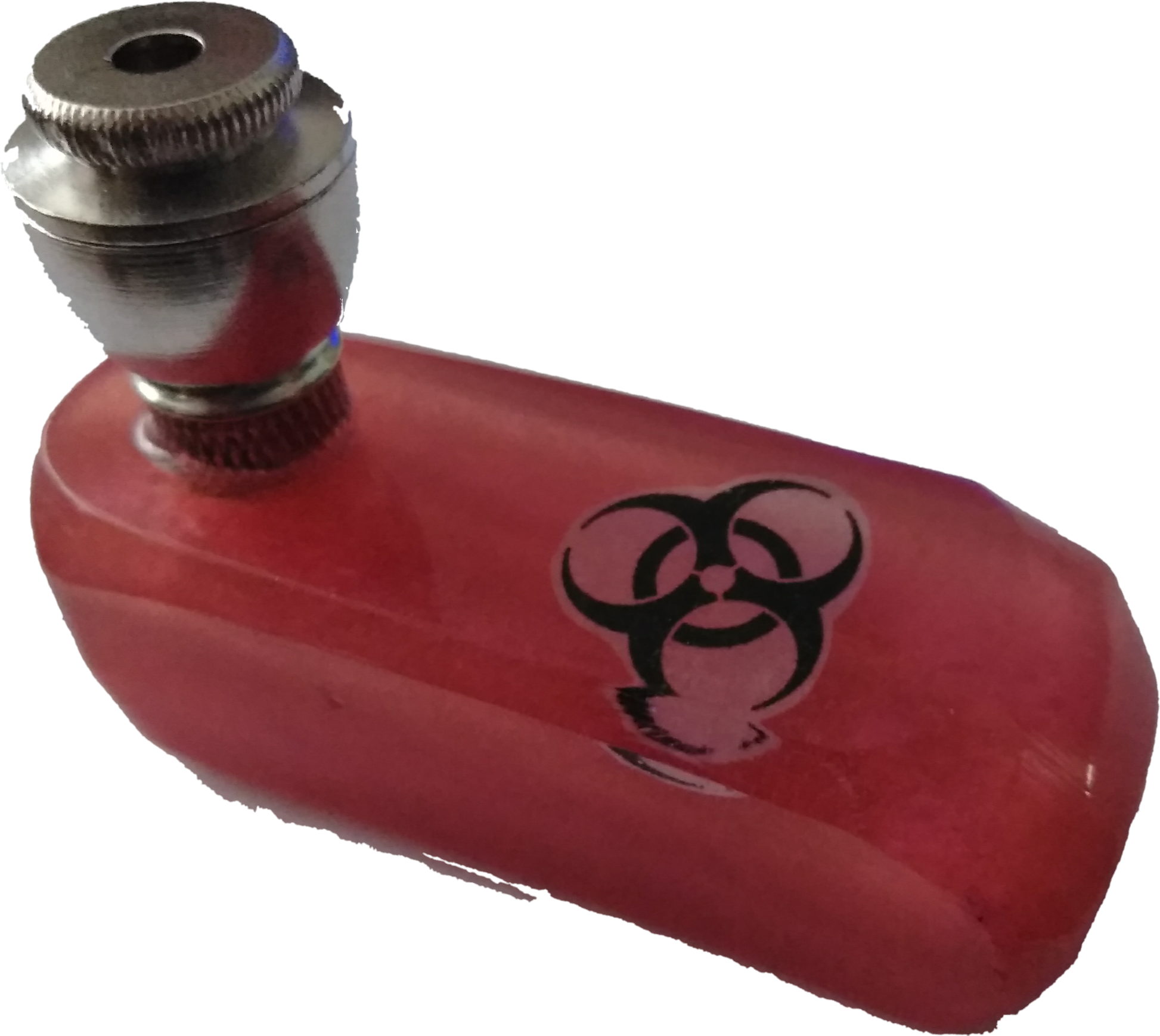 MUST BE 21 TO ORDER! This pipe is made by the Wizard in his "Glow" line of pipes. (Because it glows in the dark) Made of safe acrylic, this pipe has a slight bend to it to be more comfortable in the hand. Pink with a clear top layer, this fine mica pipe has a 'Biohazard' symbol made within it. This pipe has felt on the bottom to keep from damaging tabletops or clanking when being put down. Perfect for portability and personal use. This pipe is unique and one of a kind. This pipe comes with a bowl top.