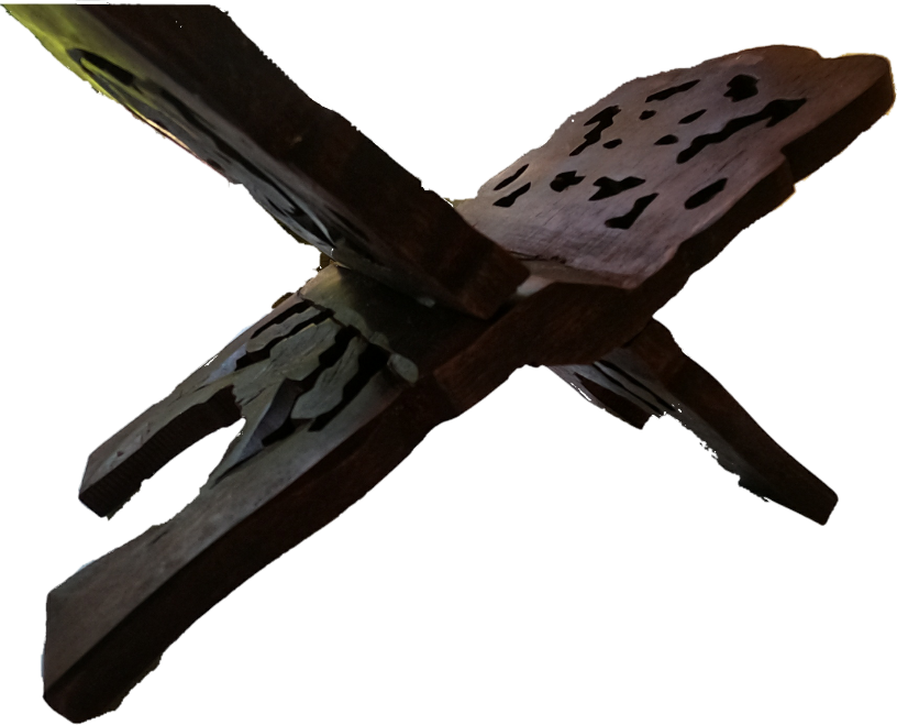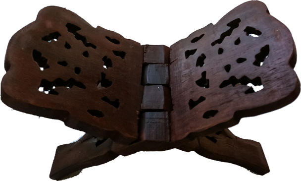 This hand carved, light weight book holder was hand made in India. It is roughly 10 inches. It can fold flat for stowing away if need be. Perfect for those with bad eyesight or for an altar, as well as those DMs that need more room for the many books they have open at any given time. It can be used to display those books which would increase one's standing among friends. The Wizard uses his to display and study his tomes.