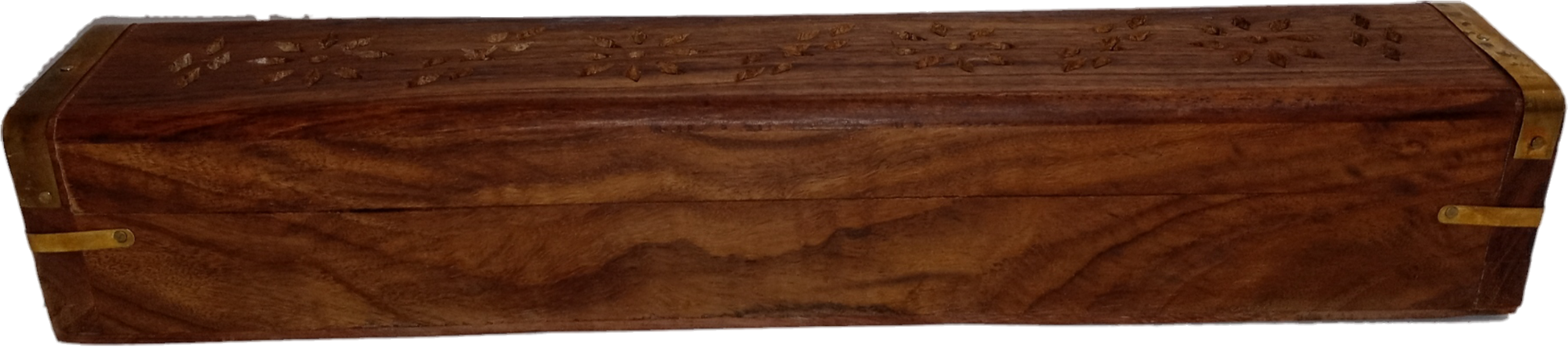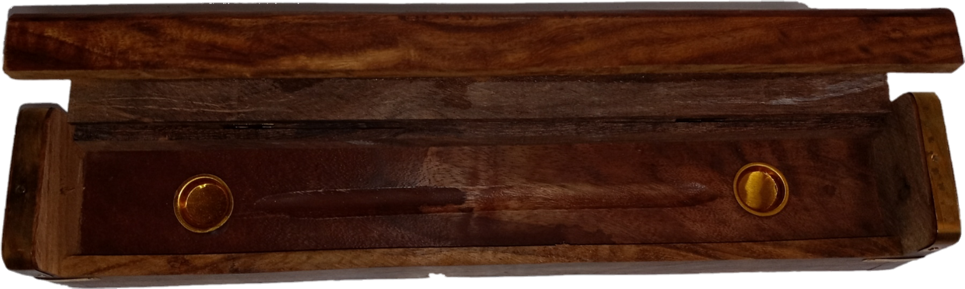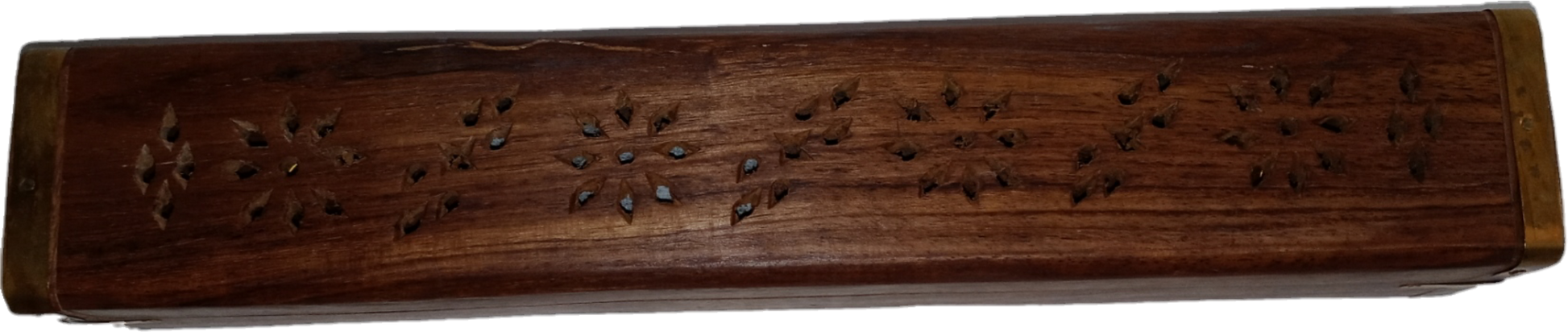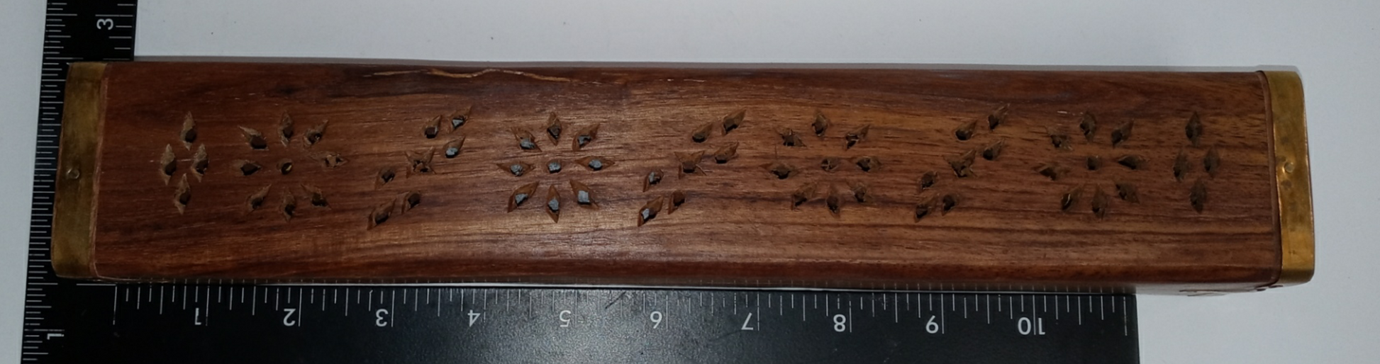 This simple, hand carved incense burner and box can burn either stick or cone incense. There is a small door on the side for incense storage and has aged brass strapping on the ends for support and to add a hint of old-world design. The simple design on top and lack of carving on the sides is perfect for those who wish to stay inconspicuous; like the Imps and Faeries that like knocking stuff over for the Fulfillment Skeletons to spend time cleaning up. Good thing the Wizard doesn't pay them. As this item is made of natural wood, grain structure may differ from burner to burner, but color will be the same. This item is imported from India.