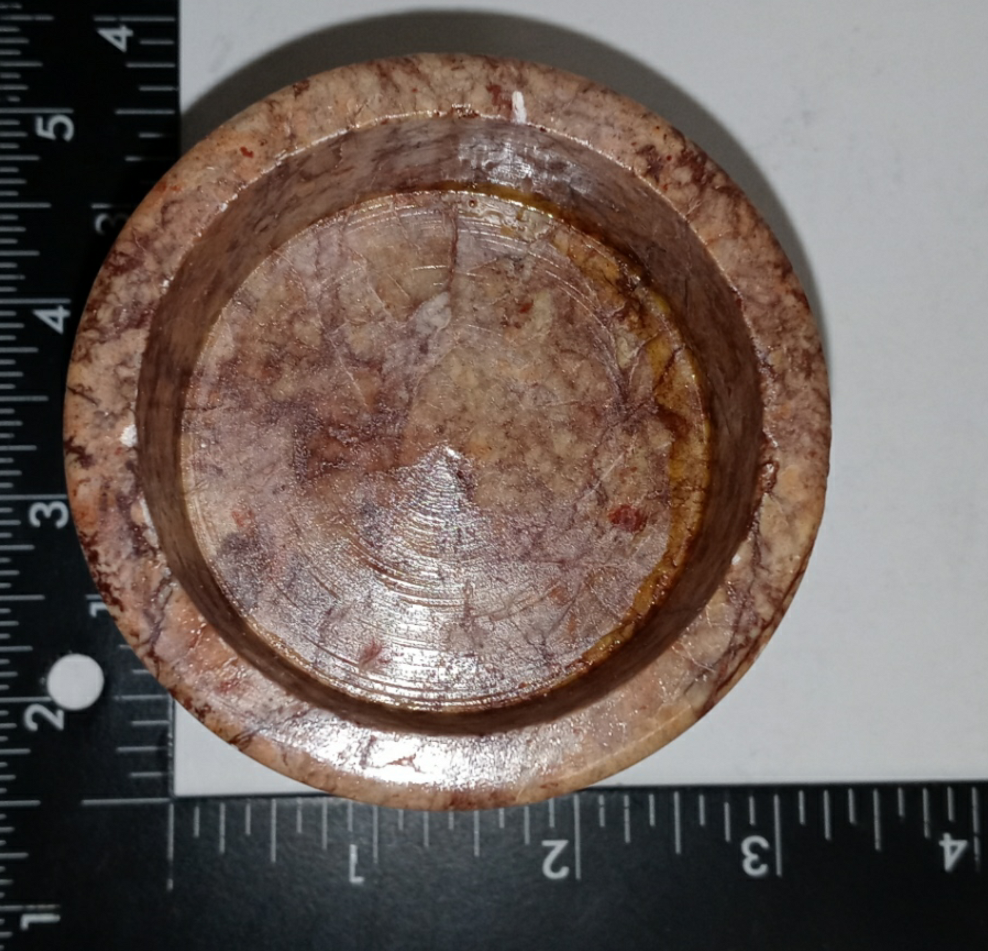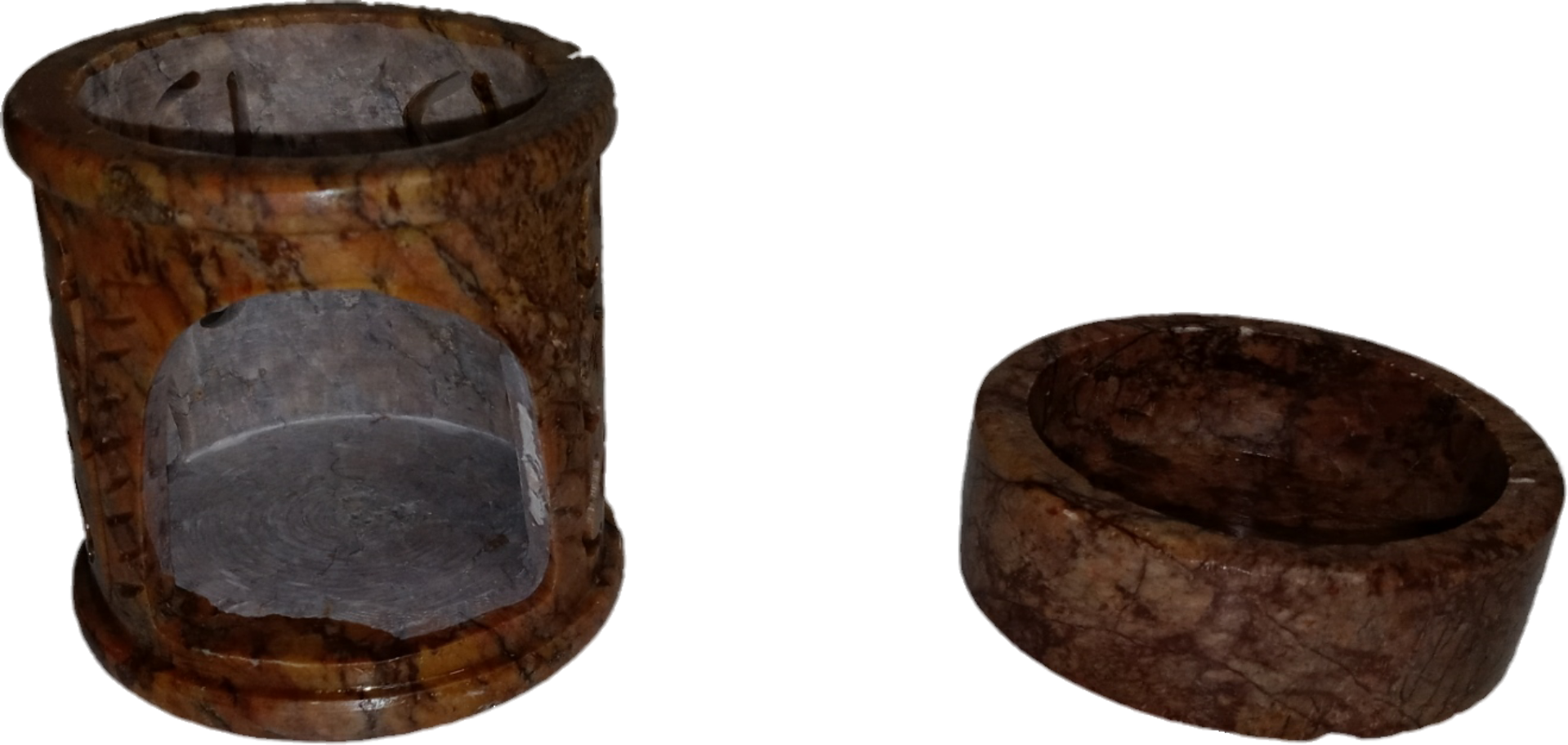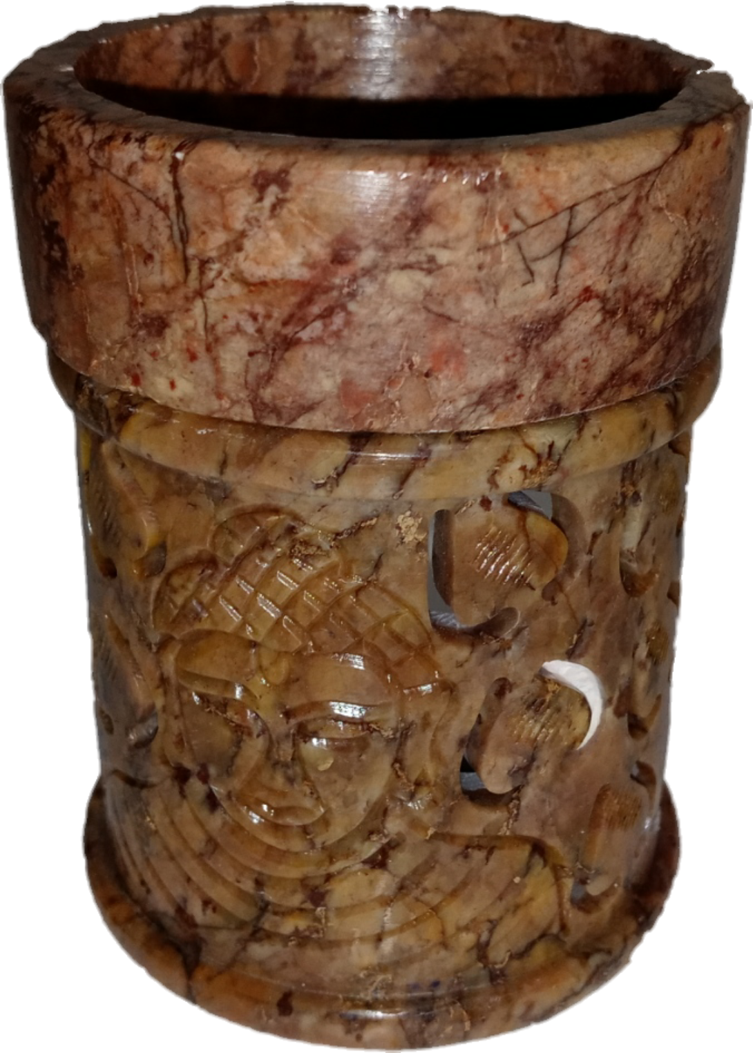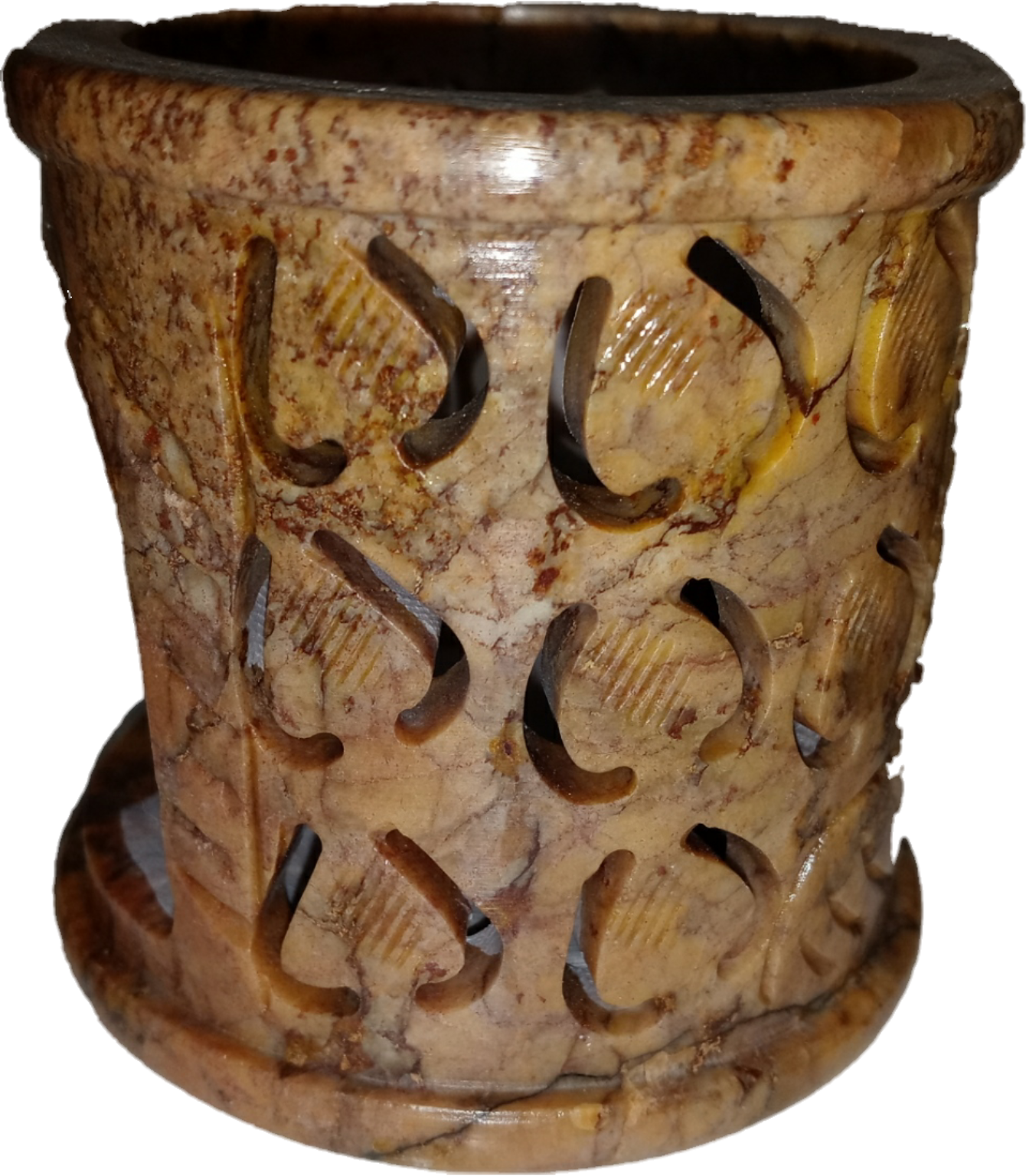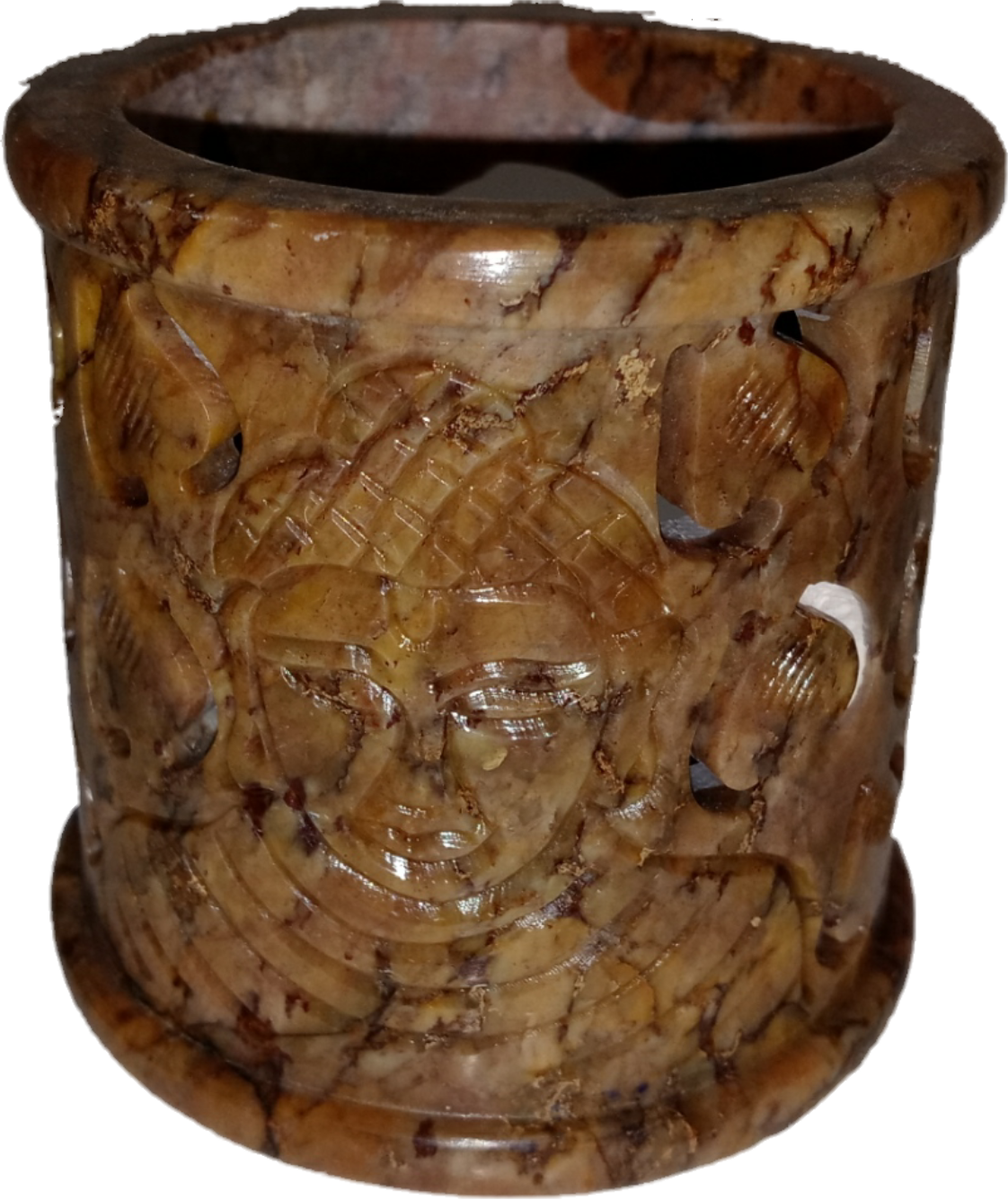 This hand carved aroma lamp has a Buddha carved into the back. Just add your tealight and oil and off you go into a mellow land of artificial peace. Hey, peace is peace, artificial or not. Take it as a win. This item is great for an altar to Buddha or just for those who love Buddha items. Being that this item is made of natural stone, grain may be different although the color should be roughly the same. This item is imported from India.