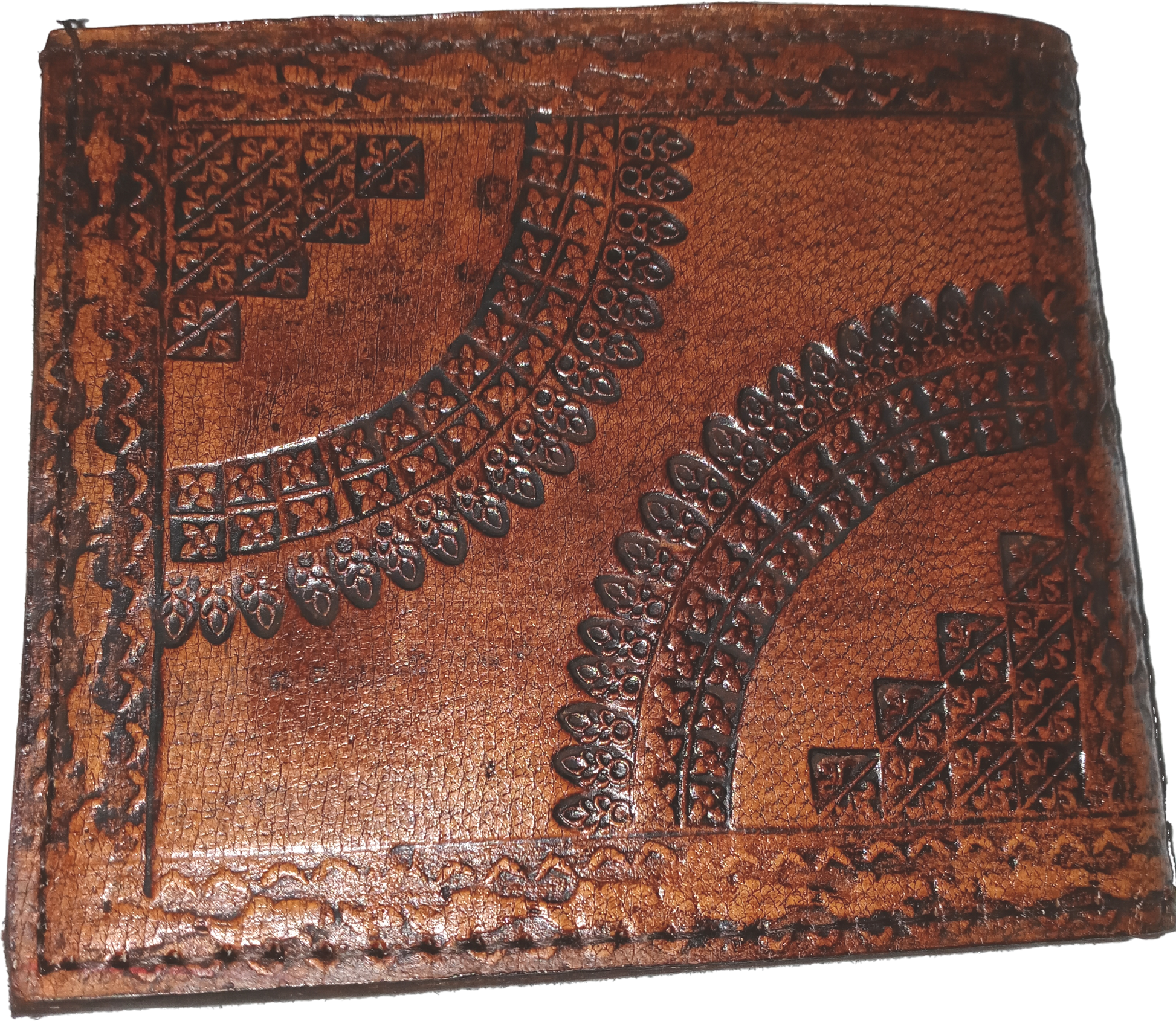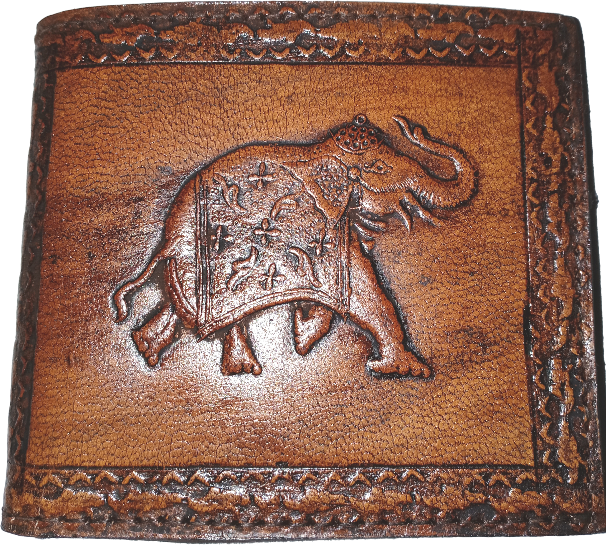 This is a handmade, American style, Indian leather wallet from India. Indian Leather is very durable and flexible. There is an elephant on one side and design on the other. Who doesn't love elephants? There are pockets on the inside for cards, etc. Imported from India.