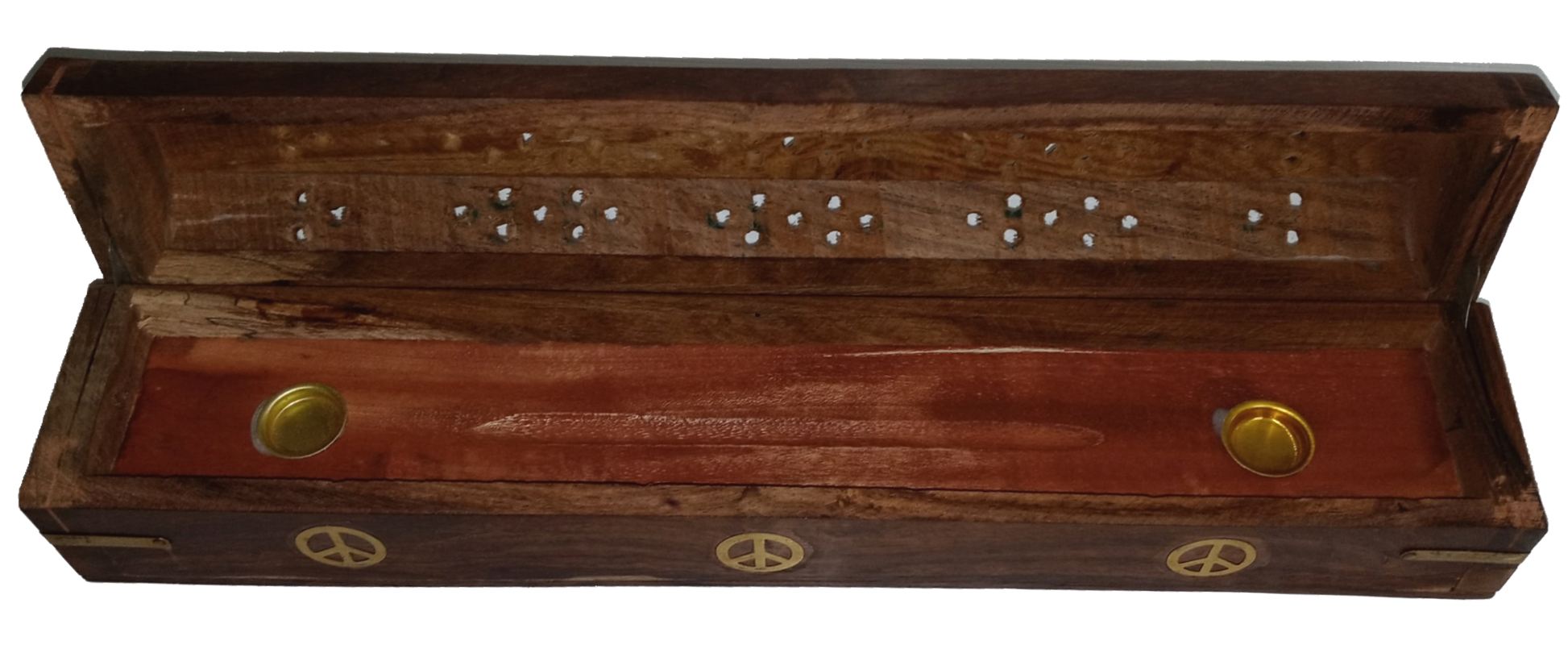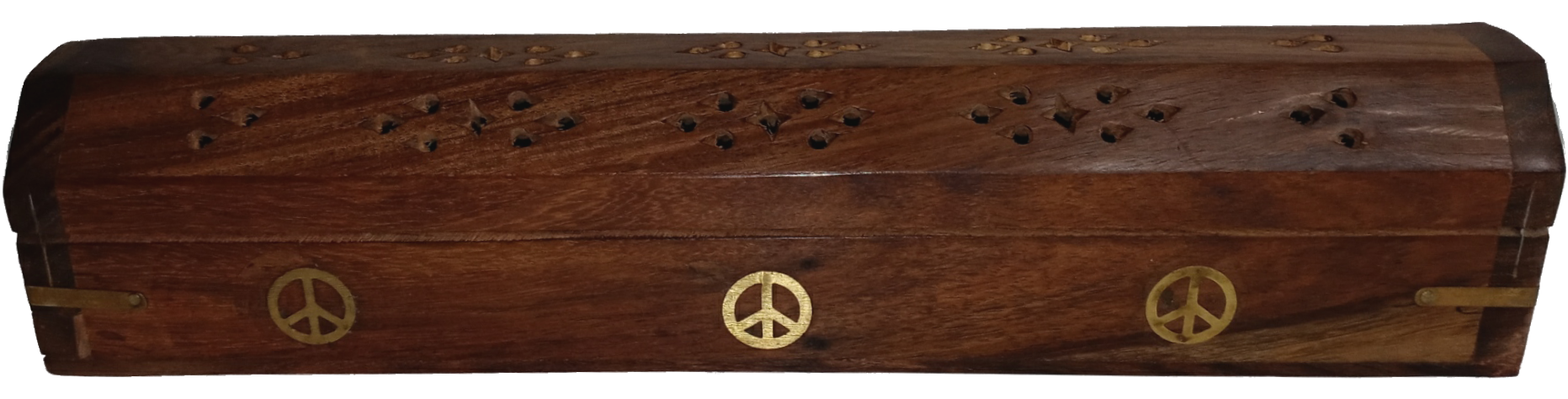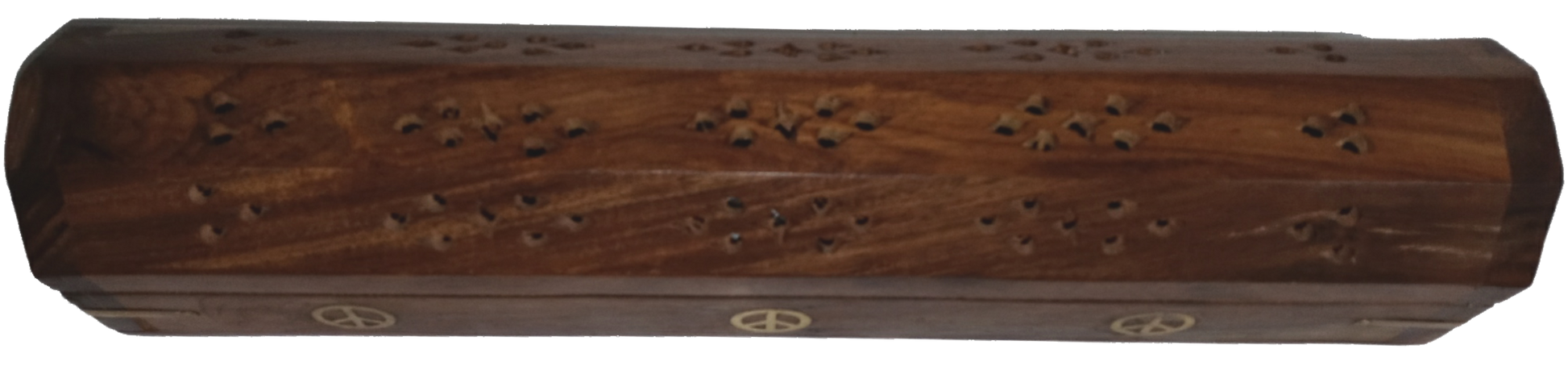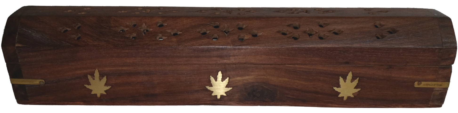 This 12" incense box and burner comes in three styles: Dragon, Marijuana Leaf, and Peace Sign. The inlays are brass (because the Gremlins insisted they be shiny). It is natural wood color and can burn either stick or cone incense. Perfect for making a tiny statement to that in-law that thinks they are better than you. There is a small door on the side opens to store incense.